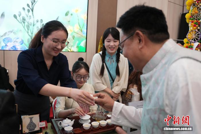 外地功夫4月26日,哈萨克斯坦阿斯塔纳,亚洲互相合作取信赖步伐集会(CICA)文牍处举行秋季慈悲义售举动,多邦驻哈中接机构携特征工艺品及特征食物明相。图为观光者正在华夏使馆铺台经验茶艺。中新社记者 单璐 摄