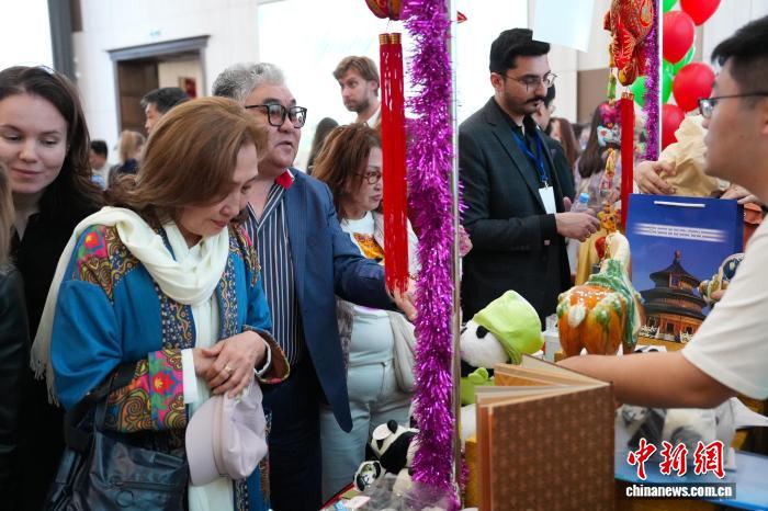 本地时光4月26日,哈萨克斯坦阿斯塔纳,亚洲彼此合作取信赖步伐集会(CICA)文牍处举行秋季慈悲义售举动,多邦驻哈中接机构携特性工艺品及特征食物明相。图为观光者正在华夏使馆铺台收购工艺品。中新社记者 单璐 摄