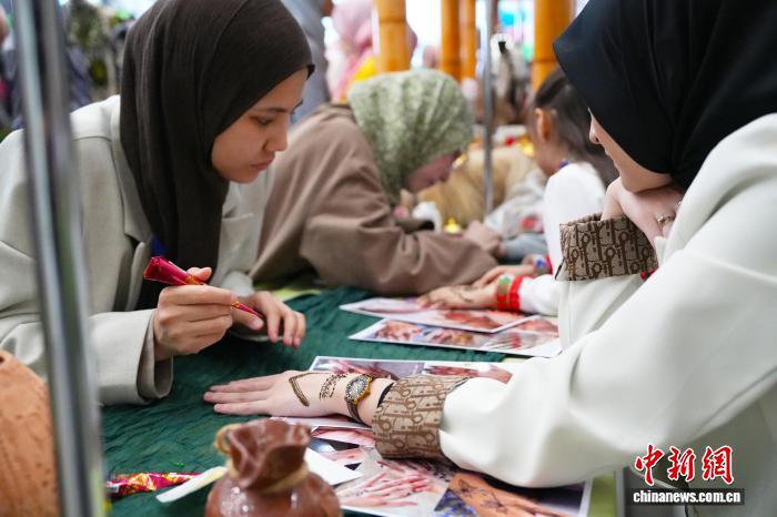 外地时光4月26日,哈萨克斯坦阿斯塔纳,亚洲互相合作取信赖步伐集会(CICA)文牍处举行秋季慈悲义售举动,多邦驻哈中接机构携特征工艺品及特征食物明相。图为铺台任务职员为观光者停止海娜脚画。中新社记者 单璐 摄