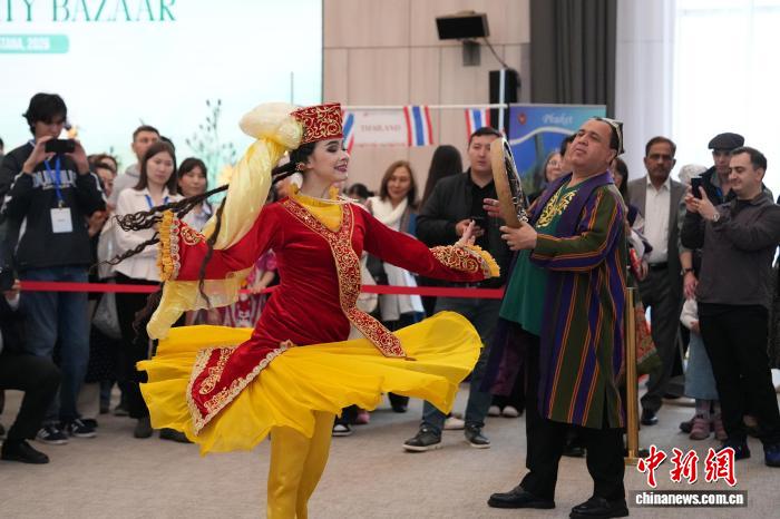 本地时代4月26日,哈萨克斯坦阿斯塔纳,亚洲彼此合作取信赖步伐聚会(CICA)书记处举行秋季慈悲义售举动,多邦驻哈中接机构携特征工艺品及特征食物明相。图为义售举动现场的文艺演出。中新社记者 单璐 摄